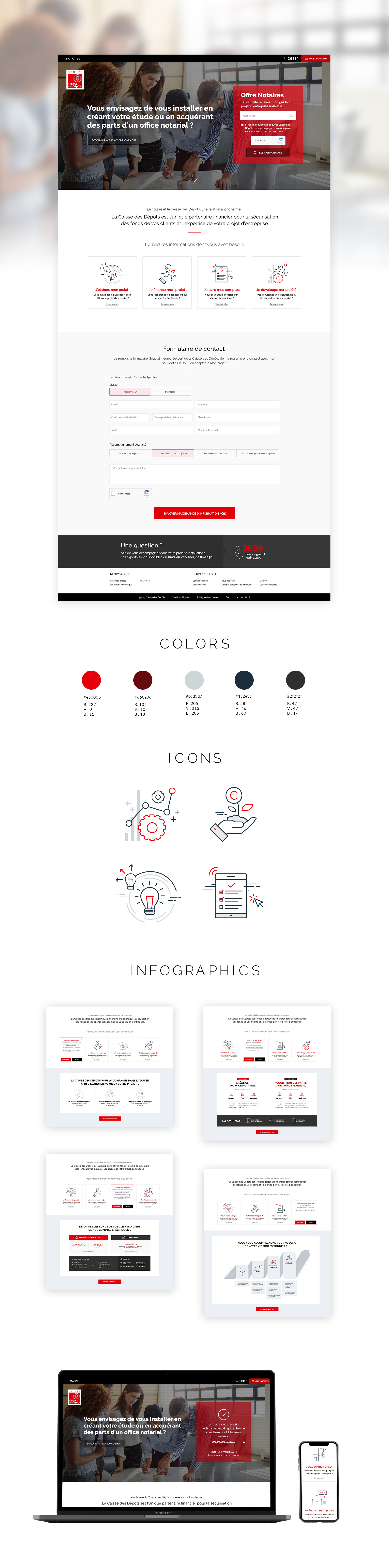 Conception graphique du site "Notaires" pour la Caisse des Dépôts. Travail en équipe pour les animations. Site accessible (RGAA).