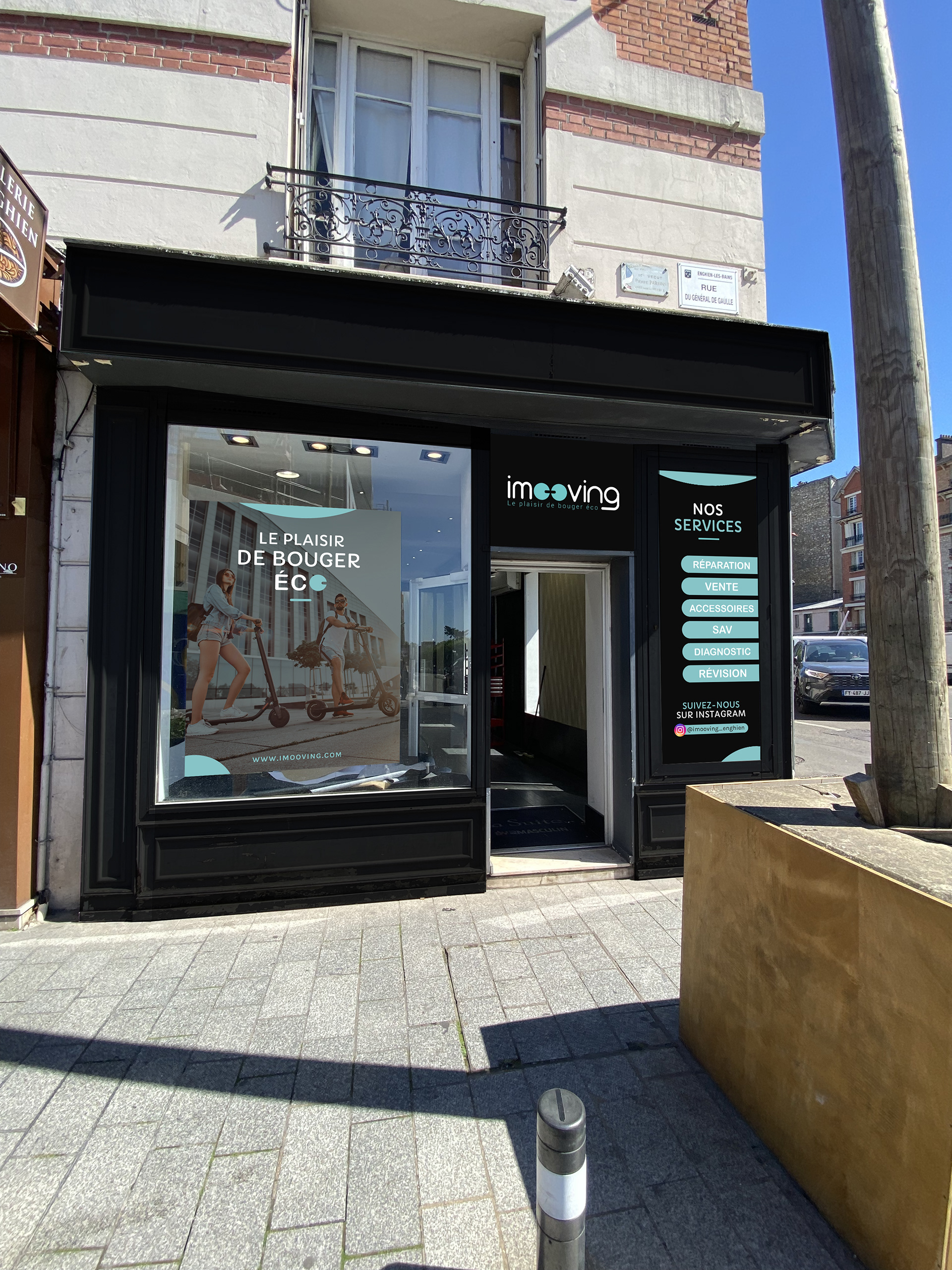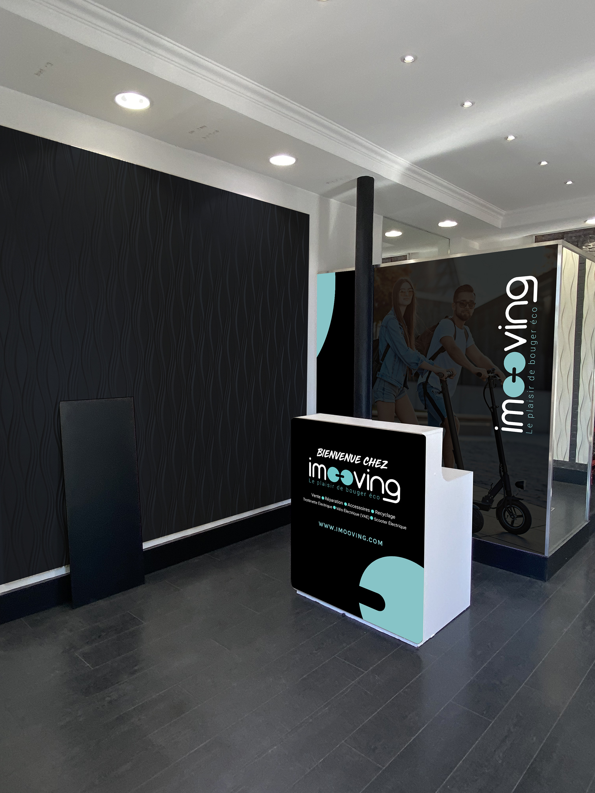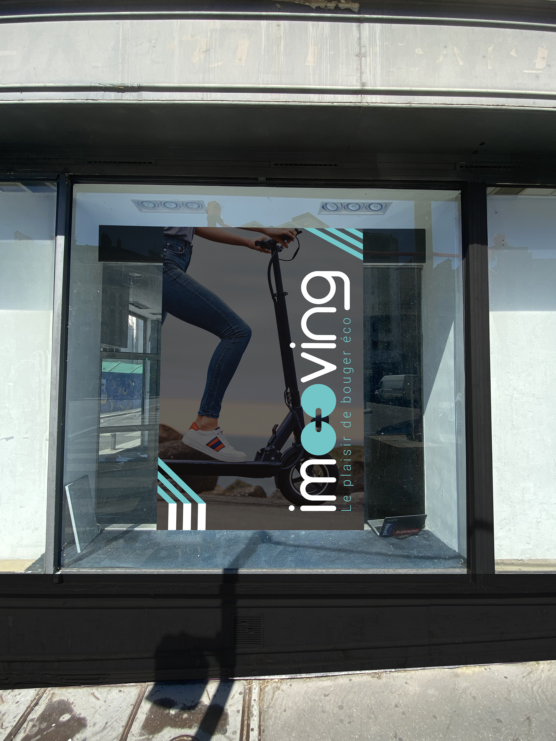 Création des visuels pour la vitrine et l'intérieur de la boutique de trottinettes électriques Imooving à Enghien-les-Bains.