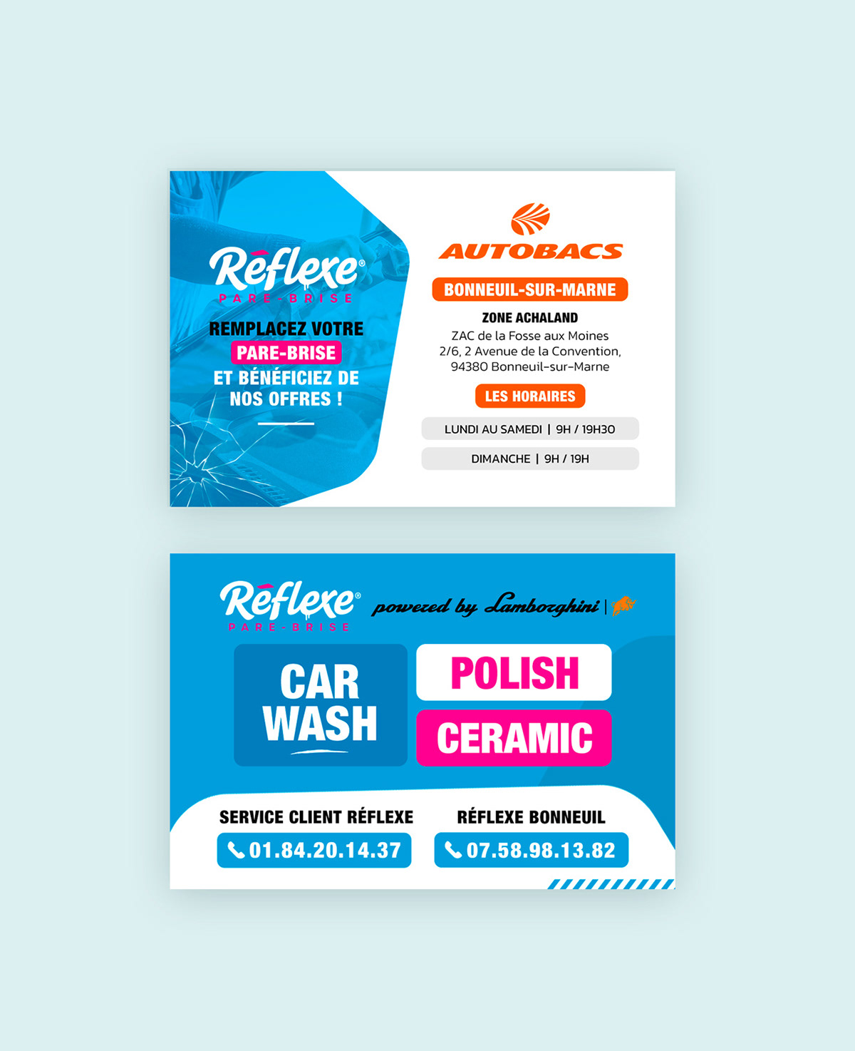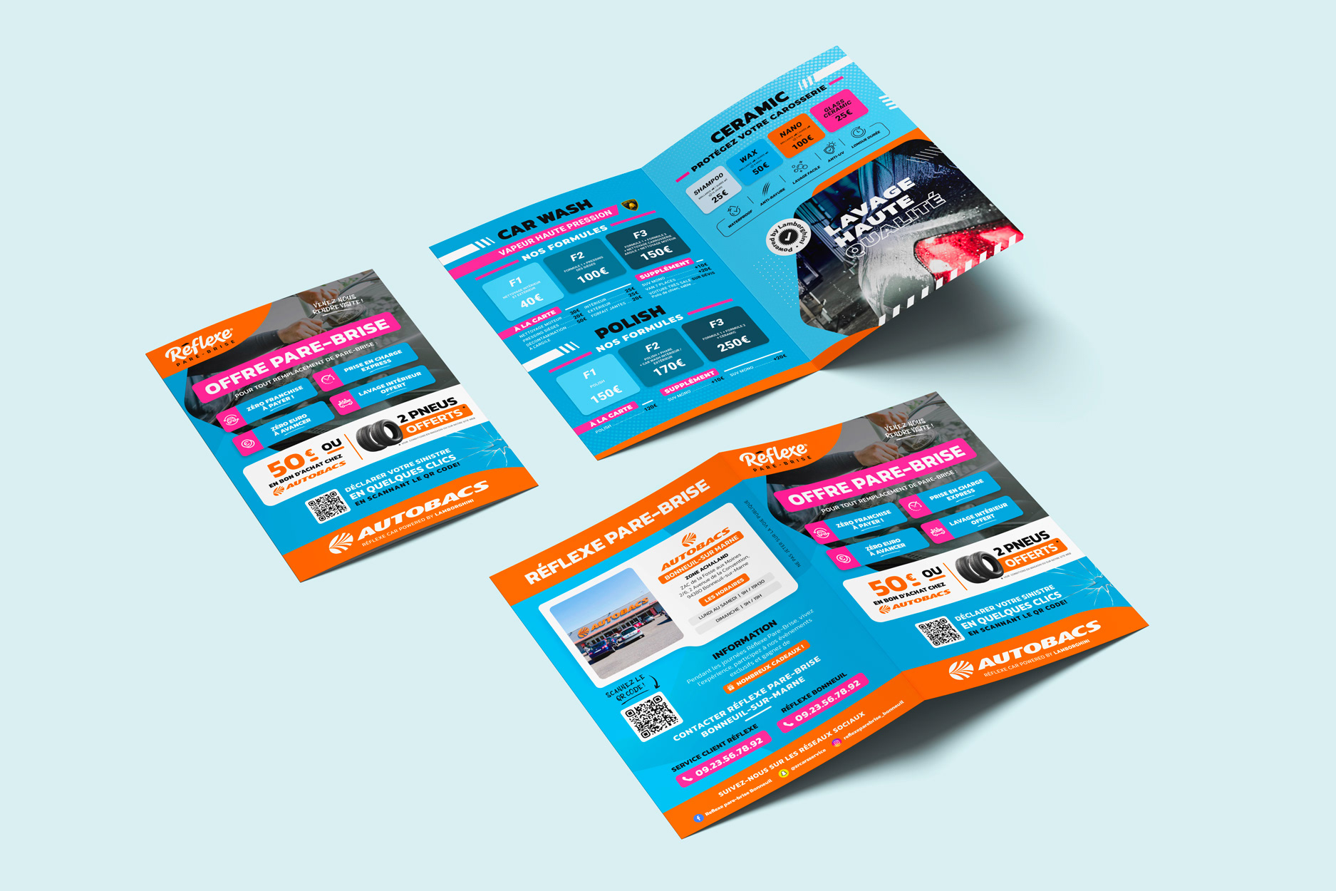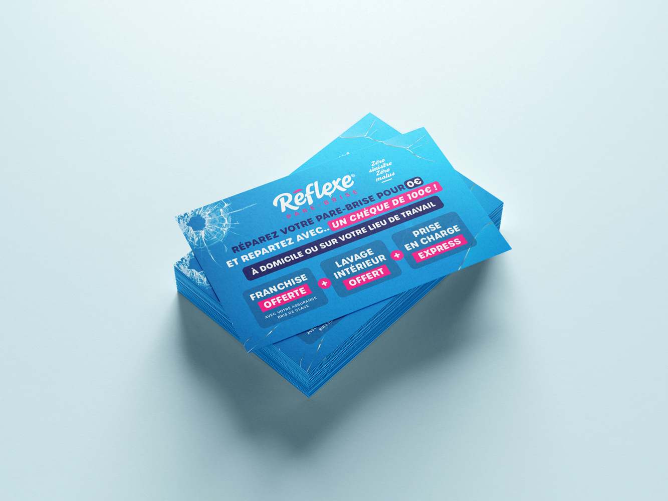 Création de différents supports d'impressions (Dépliant, Bâche, Carte de visite, Covering, Roll-up) réalisés pour la société Reflèxe Pare-Brise qui dispose de plusieurs enseignes en France.