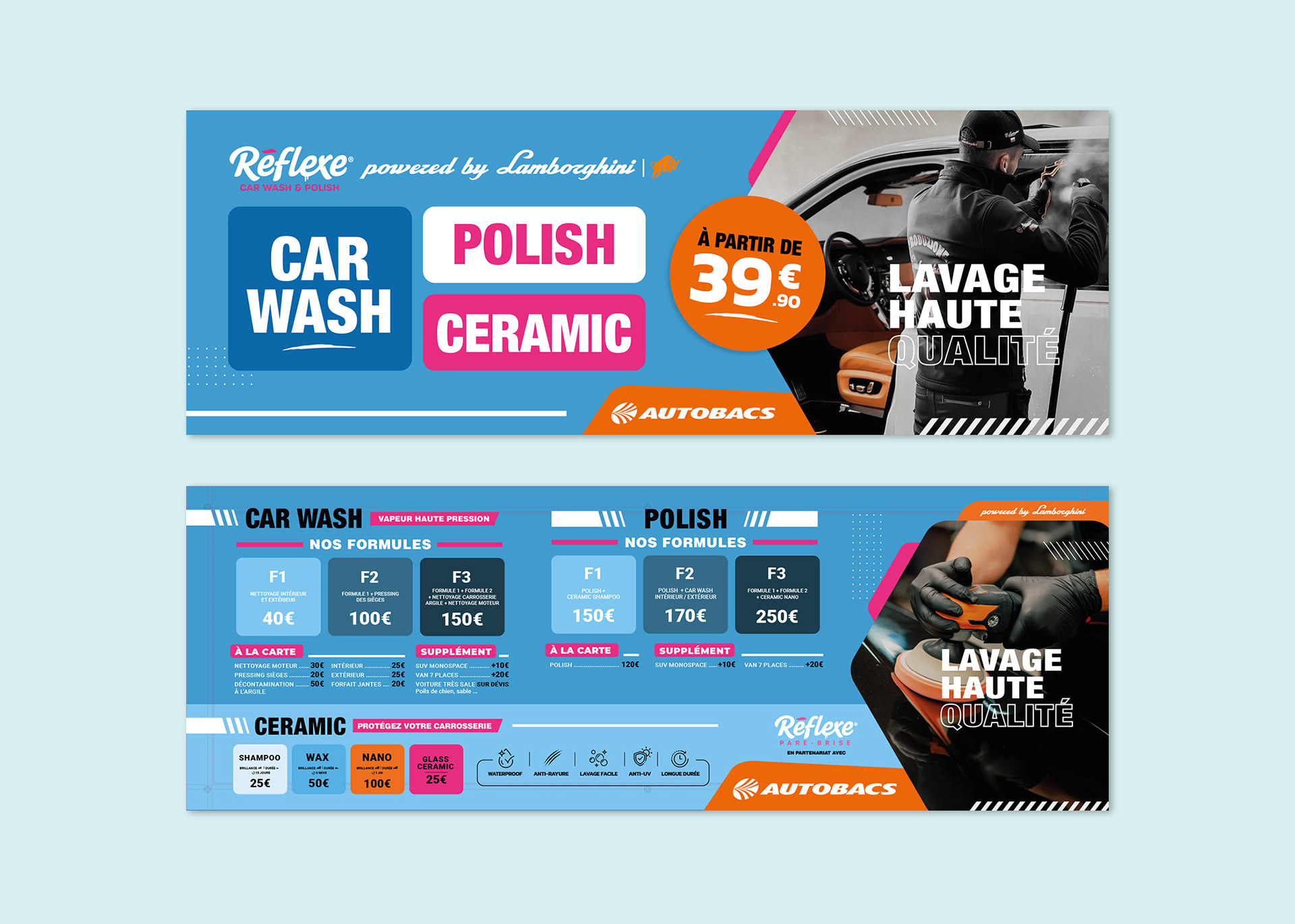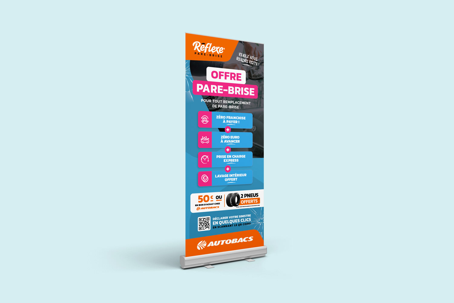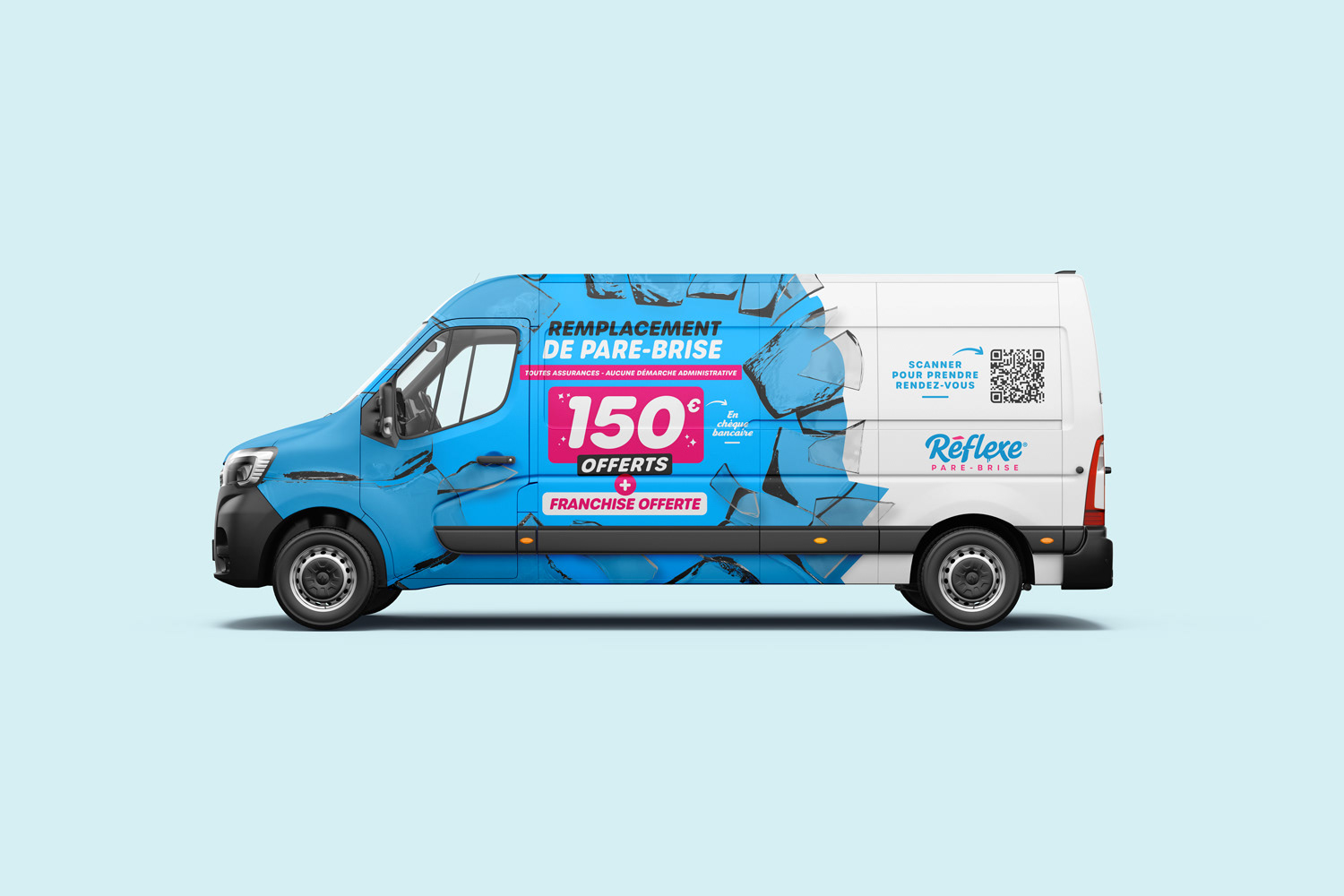 Création de différents supports d'impressions (Dépliant, Bâche, Carte de visite, Covering, Roll-up) réalisés pour la société Reflèxe Pare-Brise qui dispose de plusieurs enseignes en France.